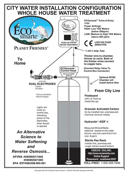 Với thiết kế kiểu dáng đẹp, chiếm ít không gian hơn so với máy làm mềm truyền thống, hệ thống ECOsmarte Point-of-Entry không chỉ là một bộ lọc, mà còn là một hệ thống lọc nước hoàn chỉnh. Nó bao gồm một ngăn chứa nước với đầu điều khiển điện tử, túi phương tiện lọc và buồng ion hóa / oxy hóa. Việc lắp đặt chỉ mất 2-4 giờ và không cần bảo trì trong ba năm.®