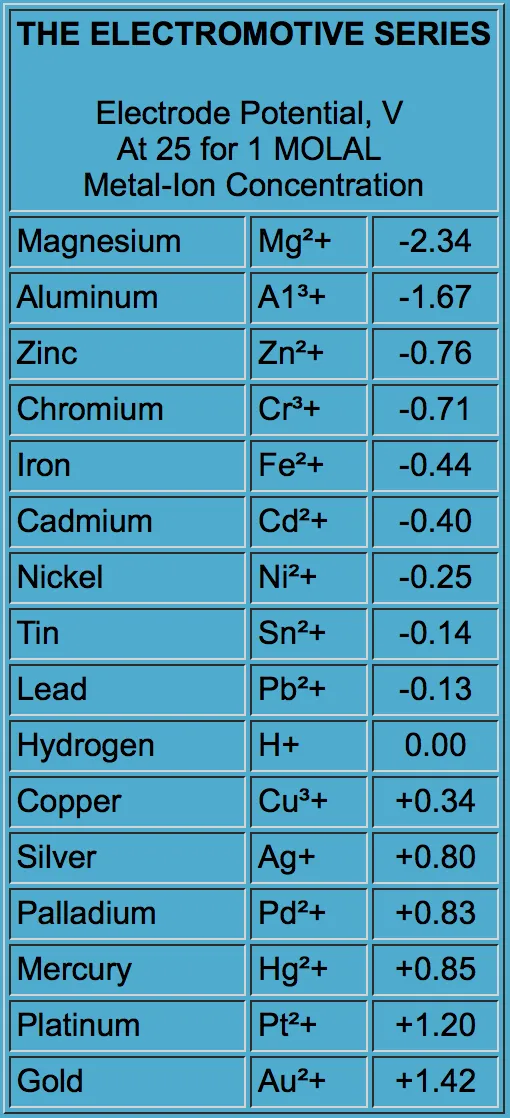 Độ âm điện được giới thiệu bởi Linus Pauling vào năm 1932 và được ông mô tả là “cường độ mà tại đó một electron được giữ bởi một nguyên tử trong một liên kết”, hoặc được định nghĩa thêm là xu hướng của một nguyên tử có điện tích âm. Độ âm điện là thước đo lực tĩnh điện hoặc điện thế ion của điện tích hạt nhân hiệu dụng của một nguyên tố trên bề mặt của nó. Kim loại được coi là các cation liên kết với nhau bằng xi măng các electron di động. Độ âm điện phân biệt sức mạnh của một nguyên tố và khả năng dịch chuyển hoặc bị dịch chuyển trong dung dịch ion bởi một nguyên tố khác có điện tích dương hoặc âm bằng nhau. Với việc nối đất thích hợp của hệ thống ống nước, biểu đồ trên cho thấy lý do tại sao ECOsmarte® không có vấn đề về kim loại khác nhau trên các ứng dụng ống mạ kẽm.